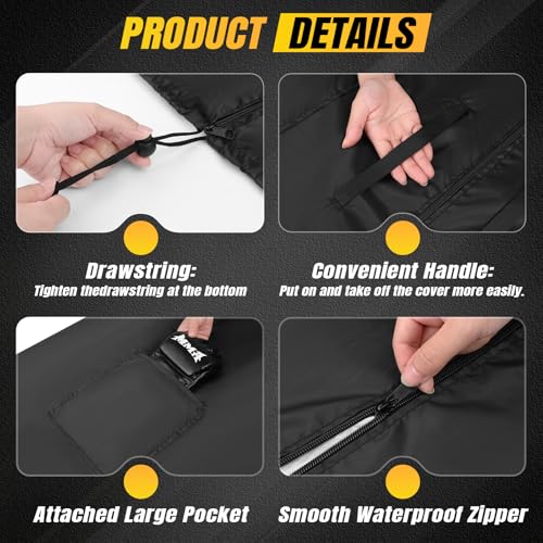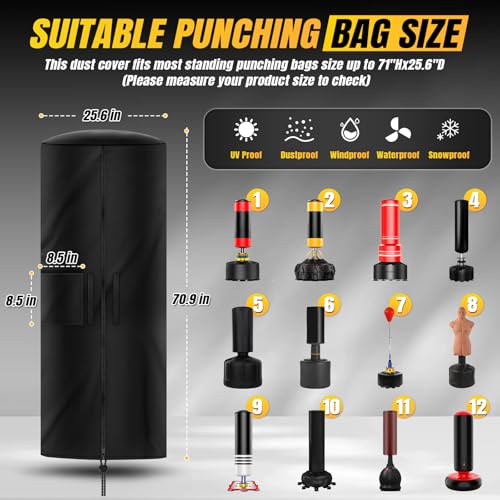 Tamaño de ajuste perfecto: la funda impermeable para saco de boxeo de 70.9 pulgadas de alto, 25.6 pulgadas de profundidad es compatible con una amplia gama de tamaños y estilos de saco de boxeo, proporciona una cobertura completa. La funda protectora para saco de boxeo es compatible con bolsas pesadas, chupete de boxeo.